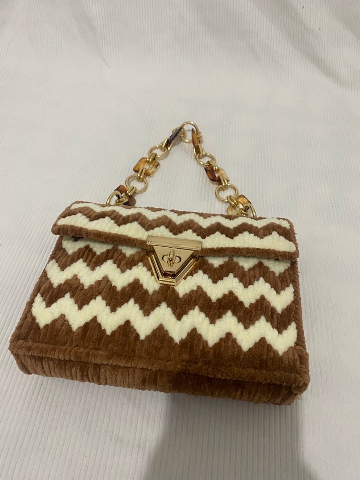 Kahverengi, yumuşak ve sıcak kumaştan yapılmış, kürk detaylı ve parlak yüzeyli kadın çantası. Zebra desenli, bohem tarzda, altın tonlu zincir saplı.