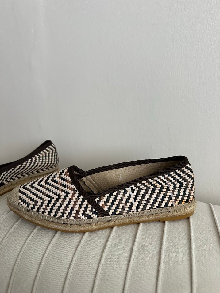 Kahverengi dolgu topuk espadriller, pilili zebra deseni ve kauçuk taban ile minimalist ve retro tarzları birleştirir.