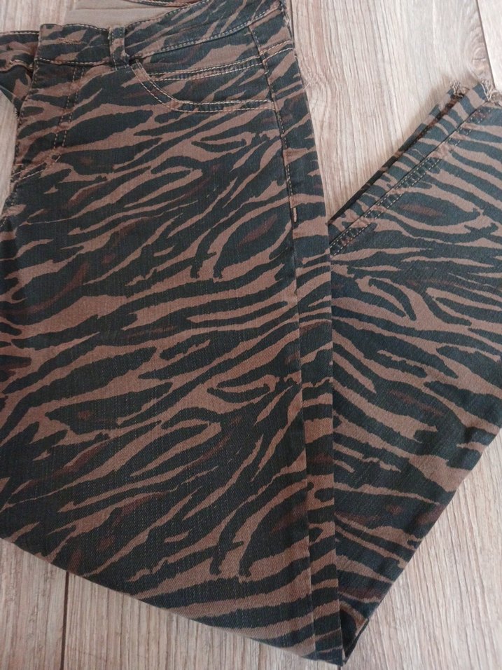 Kahverengi zebra desenli, kürk detaylı kadın kumaş pantolon. Sentetik kumaştan, midi boyda ve dar kesimdir. Dış mekan kullanımı için uygundur. ebatlar bel 37 basen47 boy 85