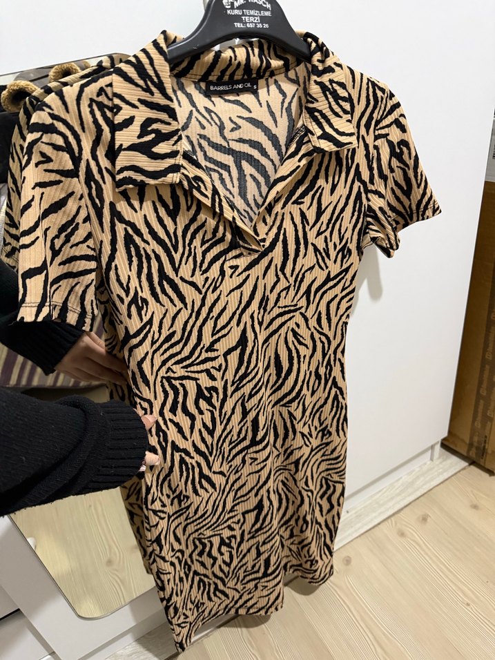 Kahverengi zebra desenli, kısa kollu, V yakalı, triko kadın elbisesi. Kürk detaylı, midi boyda, rahat ve şık sokak stili elbise.