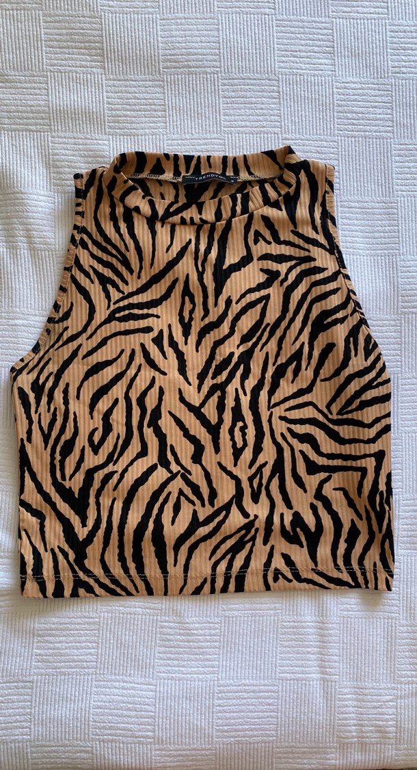 Kahverengi zebra desenli, yüksek yakalı kolsuz crop top. Örme sentetik kumaştan, dar kesim ve günlük sokak stili için uygun.
