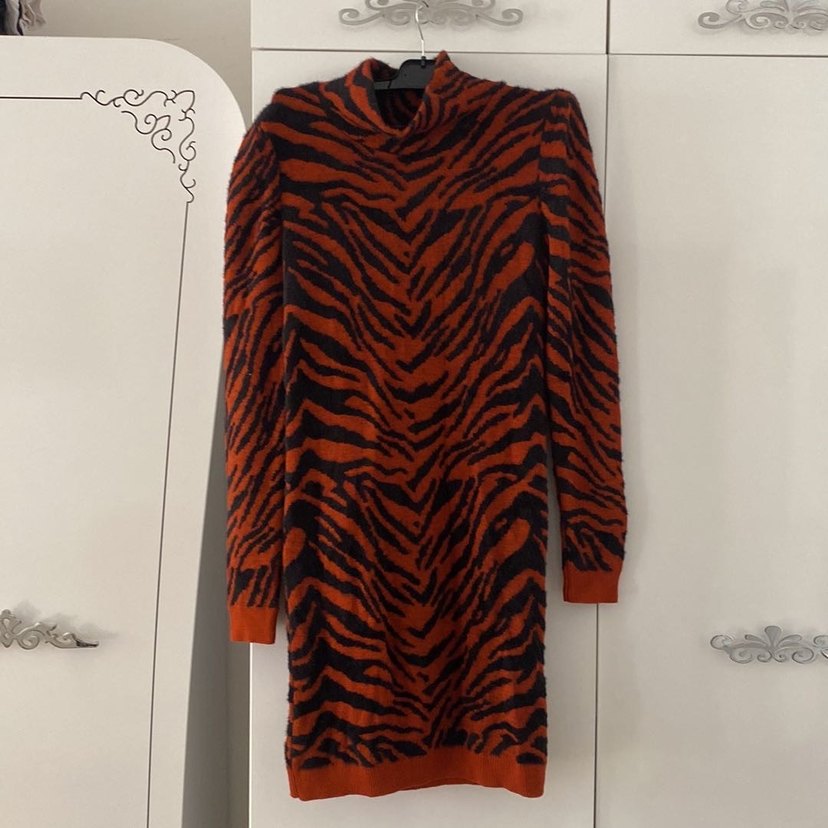 Koton L Beden .Yüksek yakalı, uzun kollu ve kahverengi zebra desenli, kürklü detaylara sahip, bohem ve retro tarzda dar kesim midi triko elbise.