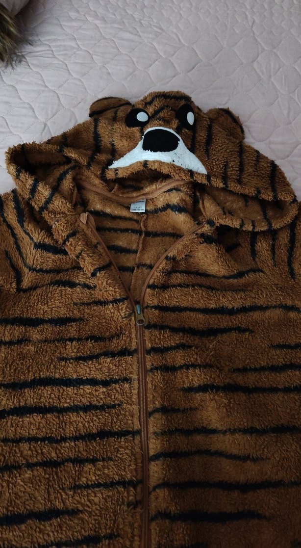 Kahverengi zebra desenli, kürklü ve kapüşonlu kedi kıyafeti, street wear tarzında şirin bir hayvan yüzü detayıyla.