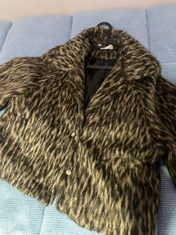 Kahverengi zebra desenli midi uzunlukta kadın suni kürk ceket, yakasında kesik yaka ve uzun kolludur. Sentetik kumaştan üretilmiş, bol kesimdir. Günlük sokak modasına uygundur.