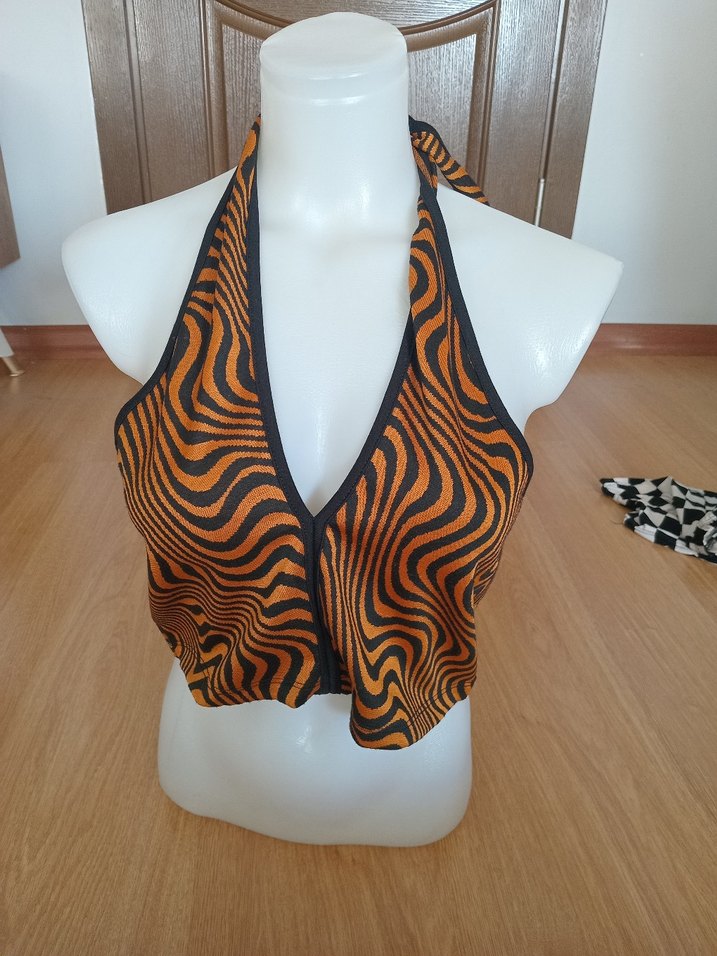 Kahverengi zebra desenli, straplez ve pileli mini büstiyer. Halter yaka ve dar kesim, sokak stiline uygun.