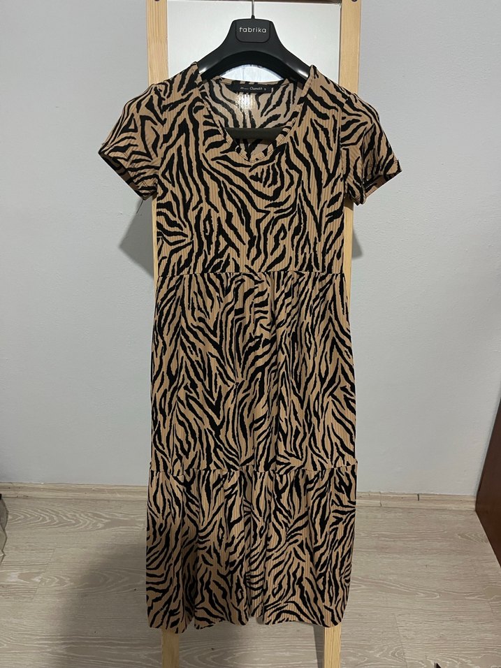 Kısa kollu, V yakalı ve kahverengi zebra desenli bu dar kesim mini elbise, sentetik kumaştan. Bohem tarzıyla günlük kullanıma uygundur. S beden Boy uzunluğu 104cm bel genişliği 72cm