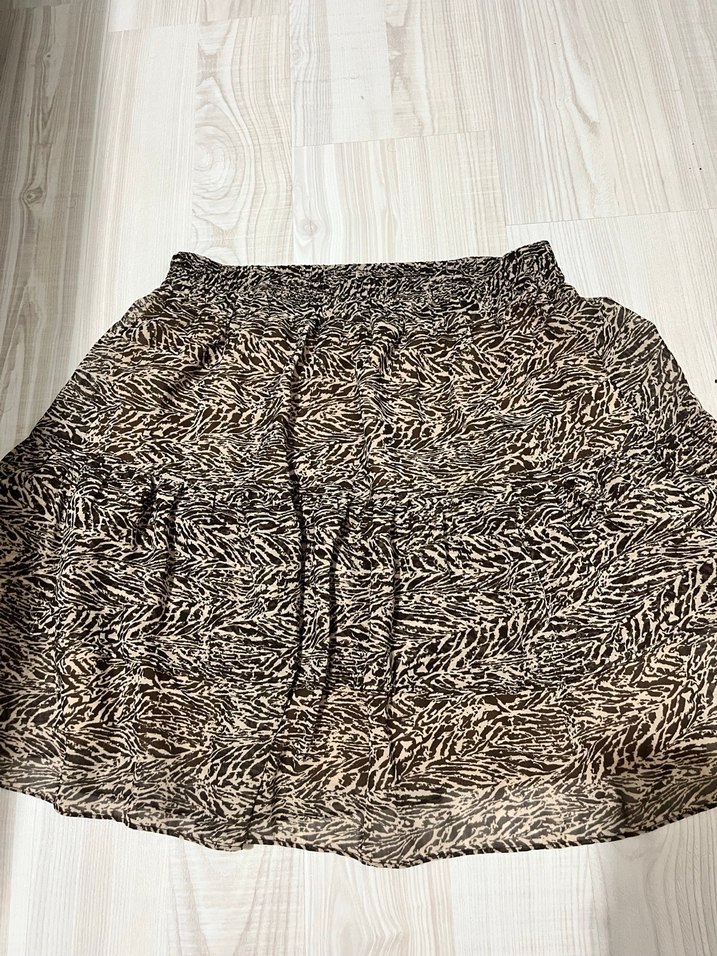 Kahverengi zebra desenli mini etek, bol kesim ve fırfırlı detaylara sahiptir. Yumuşak sentetik kumaştan yapılmıştır, bohem tarzı ve dış mekan kullanımı için uygundur.