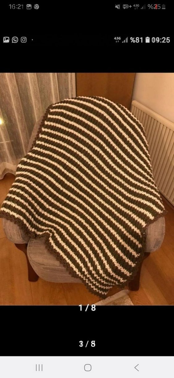 Koyu kahverengi örgü kumaştan yapılmış, zebra desenli çocuk battaniyesi. Sıcak tutar ve yumuşaktır.