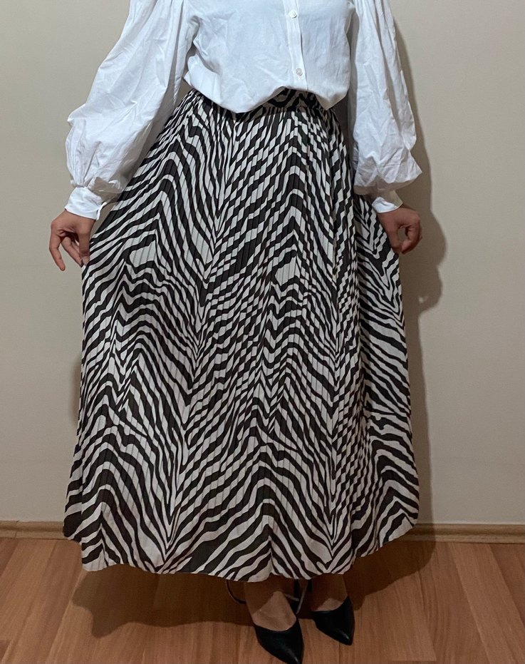 Kahverengi Zebra Desenli Pilili Uzun Etek