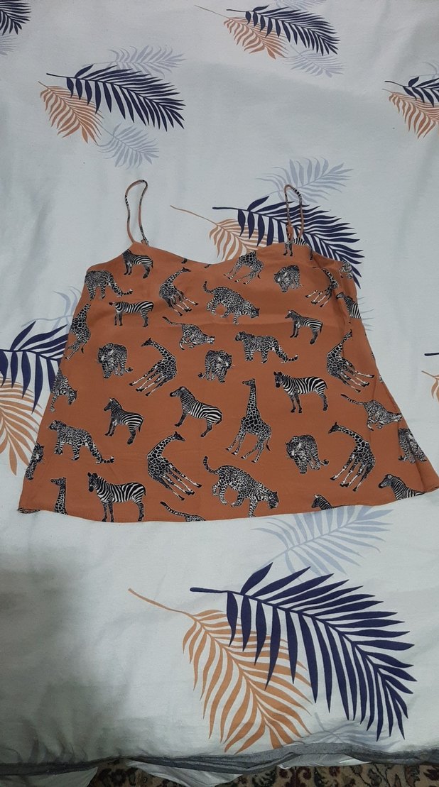 Kahverengi straplez mini bluz, zebra desenli ve fırfırlı, yumuşak sentetik kumaştan, bol kesim. Günlük kullanım için uygun.