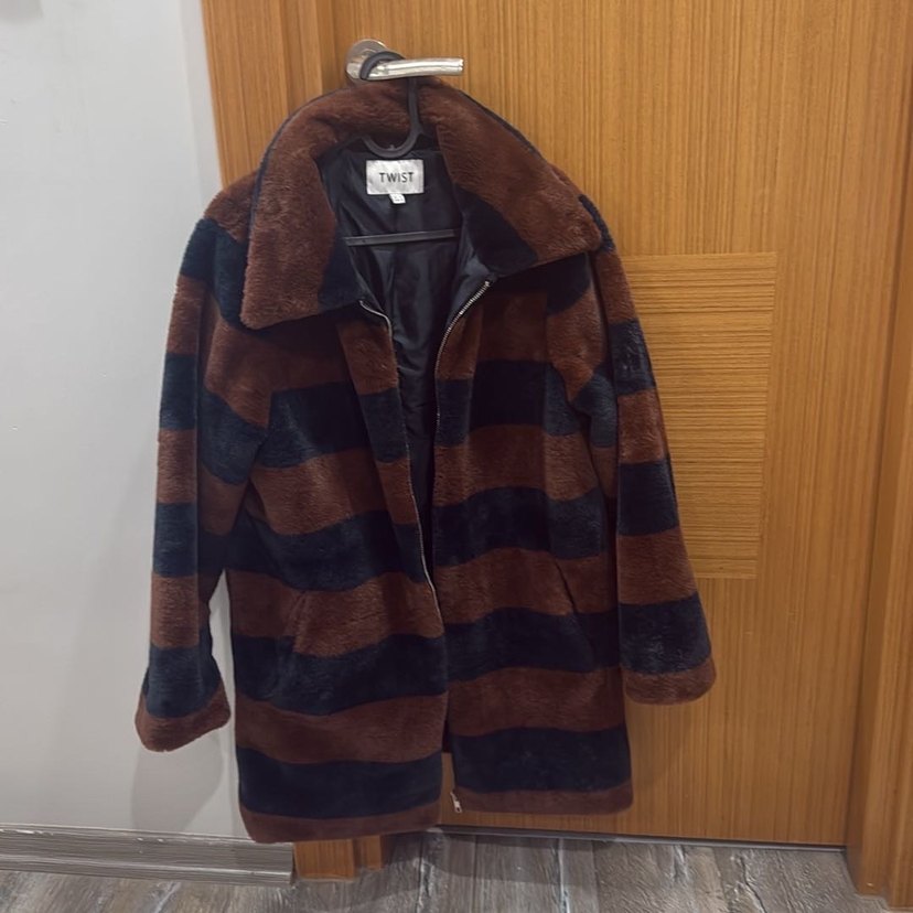 Kahverengi Zebra Desenli Suni Kürk Midi Ceket