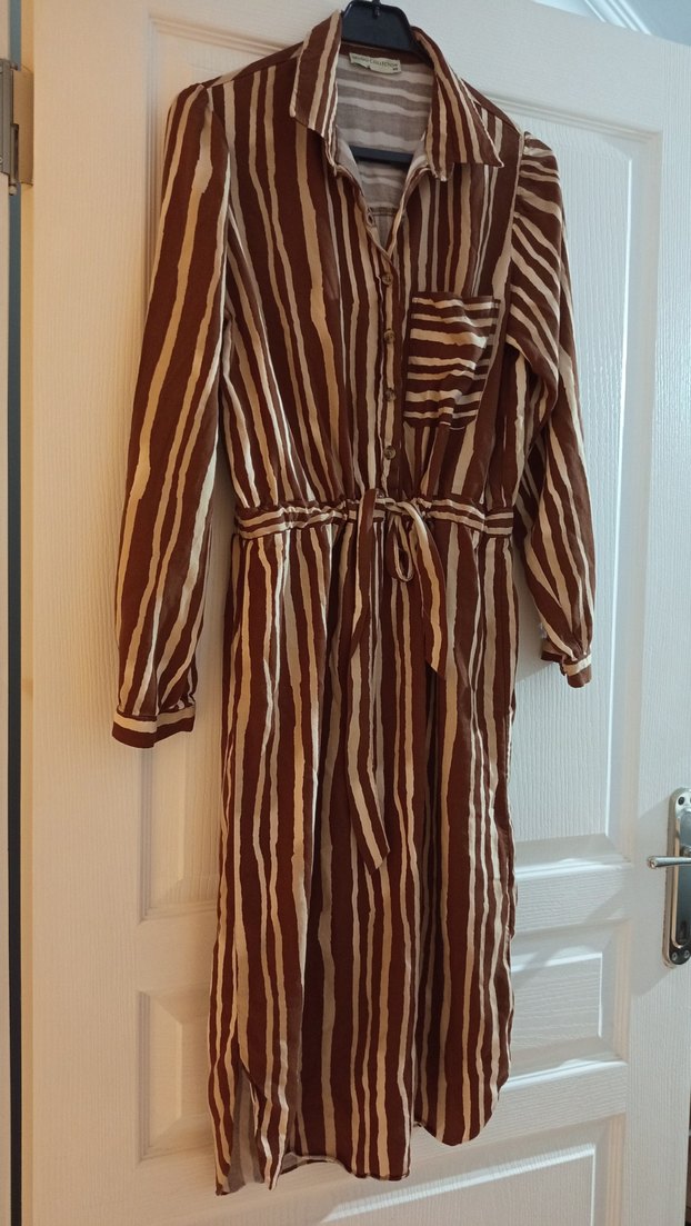 Kahverengi zebra desenli, uzun kollu, yakalı ve belden kemerli bol kesim yanlar yarım yırtmaçlı bohem elbise, yumuşak pamukluk kumaştan yapılmıştır. mudo