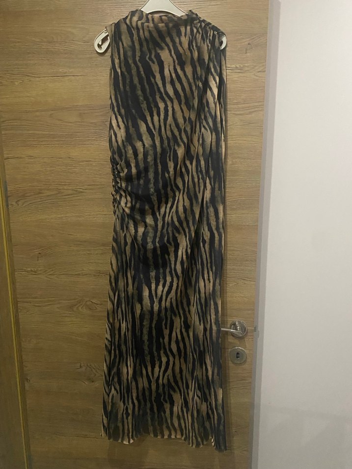 Kahverengi zebra desenli, kolsuz, midi boy elbise. Sentetik kumaştan, drapeli ve tekne yaka detaylı. Bohem ve avangard tarzda, rahat kesim outdoor kullanıma uygun.