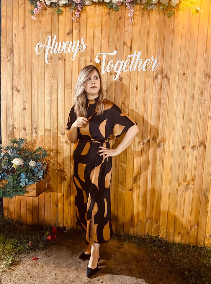 Uzun, bol kesim elbise yüksek yakalı ve askılı kollu, drapeli tasarıma sahip. Koyu kahverengi zebra deseniyle avangart ve romantik akşamlar için uygun.