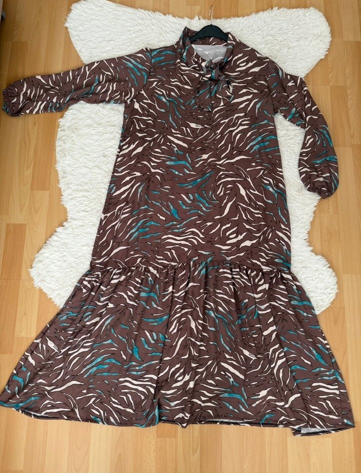 Kahverengi zebra desenli, uzun kollu ve bol kesim kadın elbisesi, kürk detaylı ve yakalıdır. Yumuşak sentetik kumaştan günlük kullanım için uygundur.