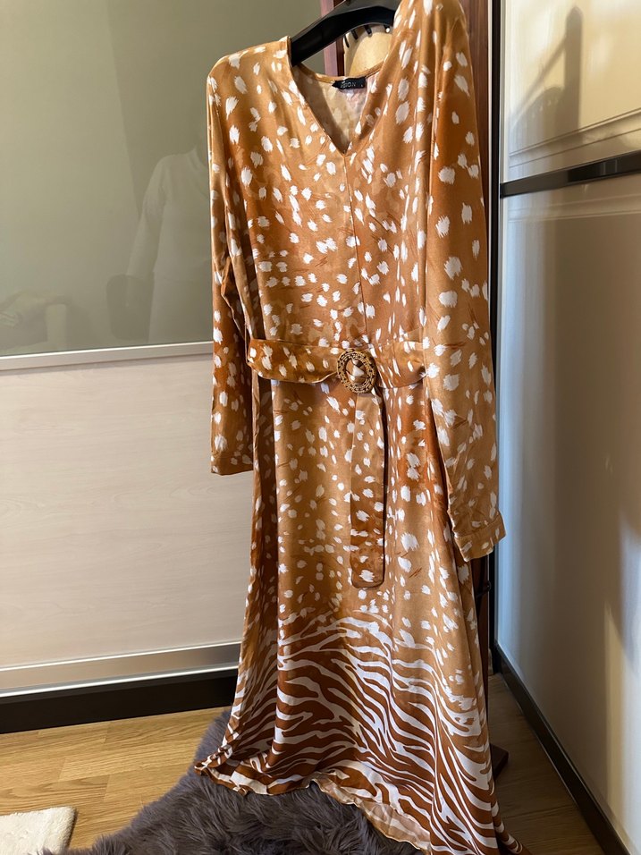 Kahverengi, parlak zebra desenli, V yakalı, uzun kollu, bol kesim, kemerli, ipeksi uzun elbise. Bohem tarzda günlük kullanım için uygundur.