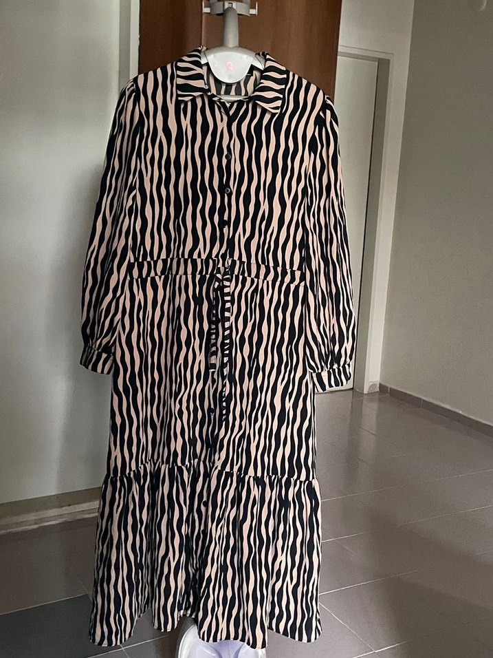 Kahverengi zebra desenli, yakalı ve kollu uzun SIFIR sorunsuz elbise. Ürün M beden olsa da kullanım durumuna göre S-M bedenlerin tümü kullanabilir. Beli ayarlanabilir iplidir. Modest kullanımı gösterebilmek için S beden üzerinde fotoğraf eklenmiştir. İki kol altı ve bel 46 omuzdan etek ucuna 117 cm