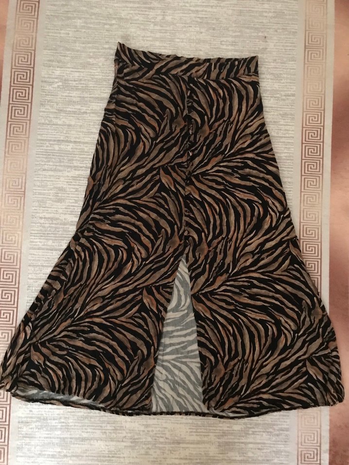 Kahverengi zebra desenli, sentetik kumaştan yapılmış, yumuşak kürk detaylı, vücuda oturan uzun etek. Bohem tarz için uygun.