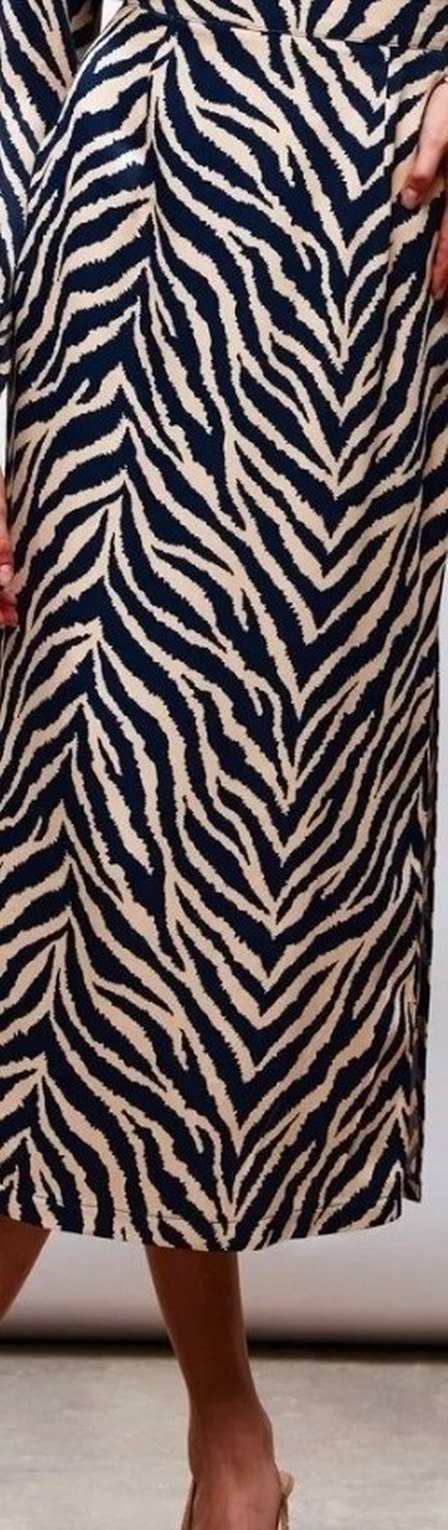 Kahverengi zebra desenli, sentetik kumaştan yapılmış, kürk detaylı uzun ve vücuda oturan kalem etek.