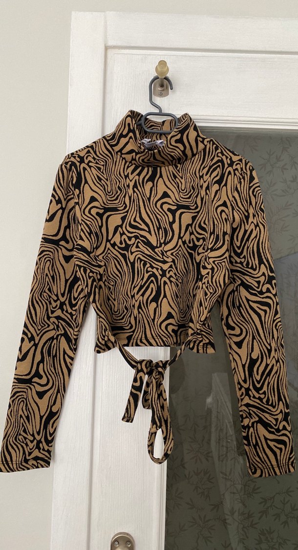 Kahverengi zebra desenli, hakim yaka ve uzun kollu, beli kuşaklı crop bluz