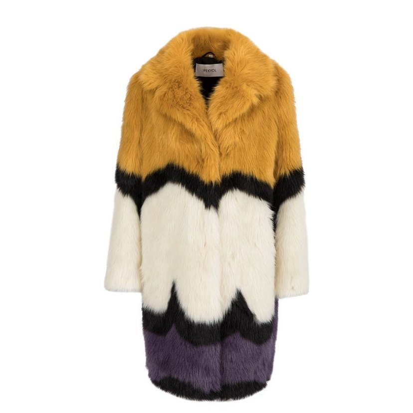 Kahverengi tonlarda zebra desenli, uzun suni kürk. Gevşek kesim, yaka detaylı ve uzun kollu, bohem sokak stili için uygun. kullanılmamış harika bir kürk modeli