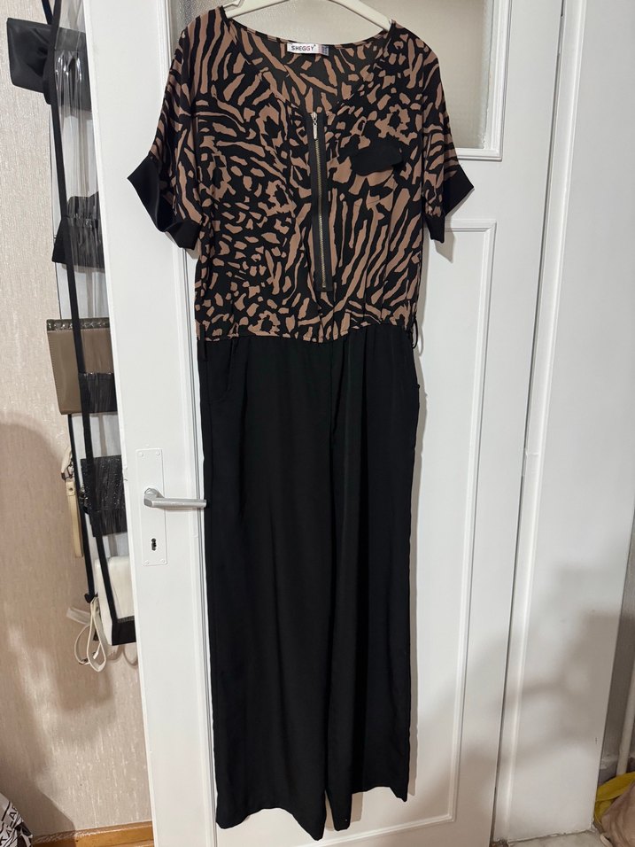 Kahverengi zebra desenli, kısa kollu, V yakalı uzun tulum. Belden kemerli, bol kesimli ve sentetik kumaştan üretilmiştir. Günlük kullanıma uygundur.