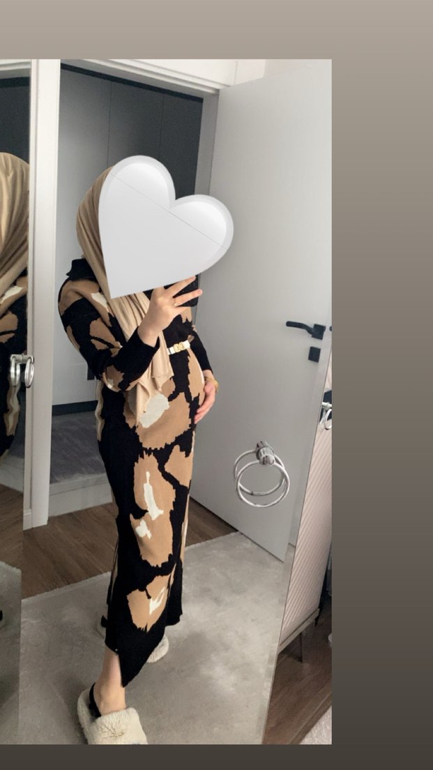 Kahverengi ve koyu zebra desenli, balıkçı yaka ve uzun kollu, vücuda oturan uzun elbisedir. Sentetik kumaştan yapılmıştır, günlük kullanım için uygundur.