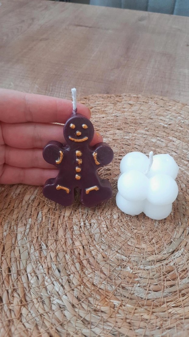 adet fiyatıdır Altın detaylı koyu kahverengi zencefilli adam mum ve yanında beyaz küme mum bulunur. İkisi de yanmak için fitil içerir.️