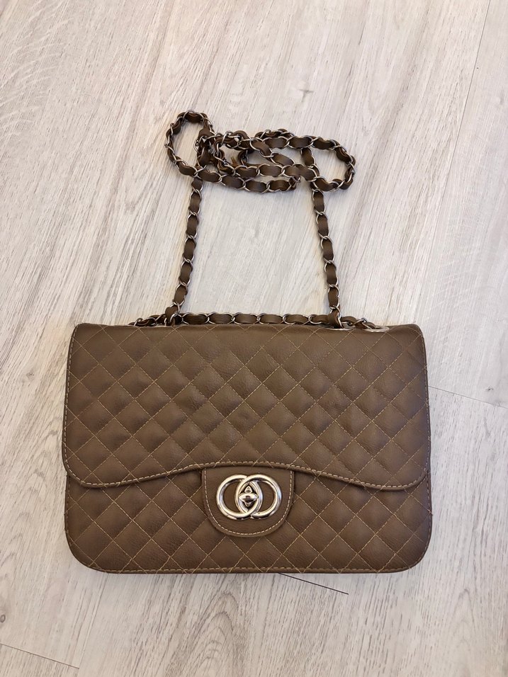 Kahverengi deri kadın çantası, zincir detaylı ve kapitone desenlidir.
