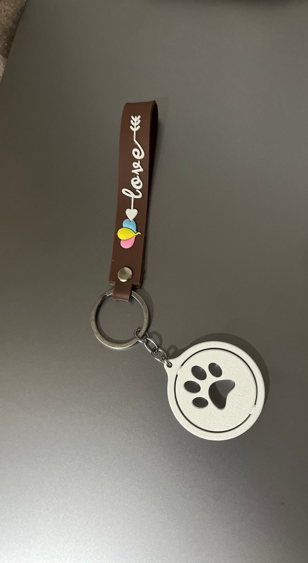 Kahverengi anahtarlık, zincir detayı ve pati izi figürü ile bohem ve minimalist tarzda tasarlanmıştır.