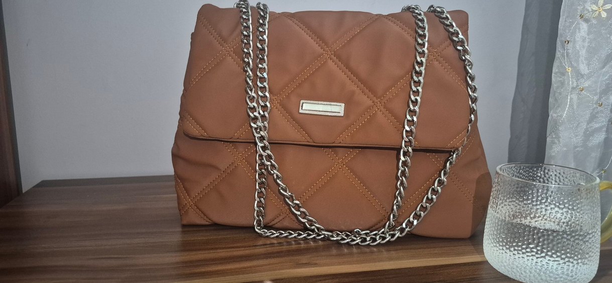 Birkac kere kullanildi. deformesi yoktur. Canli bir tabadir Kahverengi, kapitone dikişli ve parlak zincir detaylı kadın çantası. Minimalist yılan desenli, günlük kullanıma uygun.