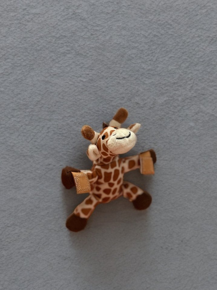 Yumuşak kahverengi zürafa peluş oyuncak, gri zemin üzerinde sevimli ve sarılmalık tasarıma sahip.