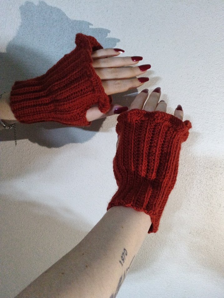Kahve rengi, örgüden yapılmış parmakları açık kadın eldiveni, bohem ve retro tarzlar için uygundur.