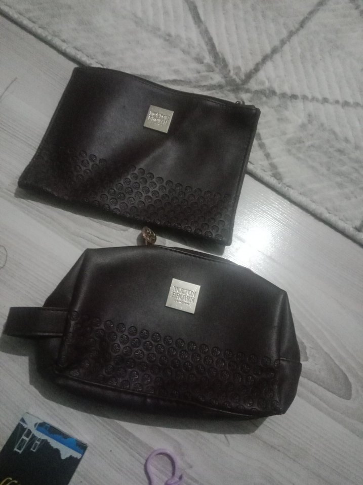 Koyu kahverengi deri makyaj çantası, fermuarlı ve minimal desenli, günlük kullanım için uygundur.
