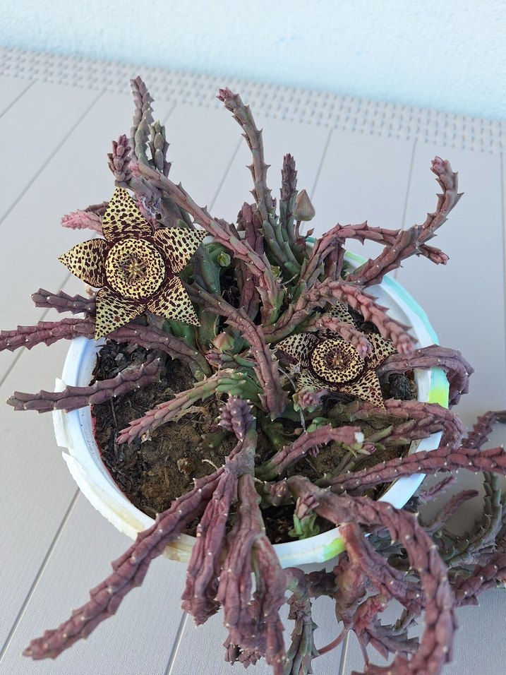 Beyaz saksıda, yıldız şeklinde çiçekleri ve uzun gövdeleri olan koyu kahverengi bitki.uzerinde tomurcukları var.