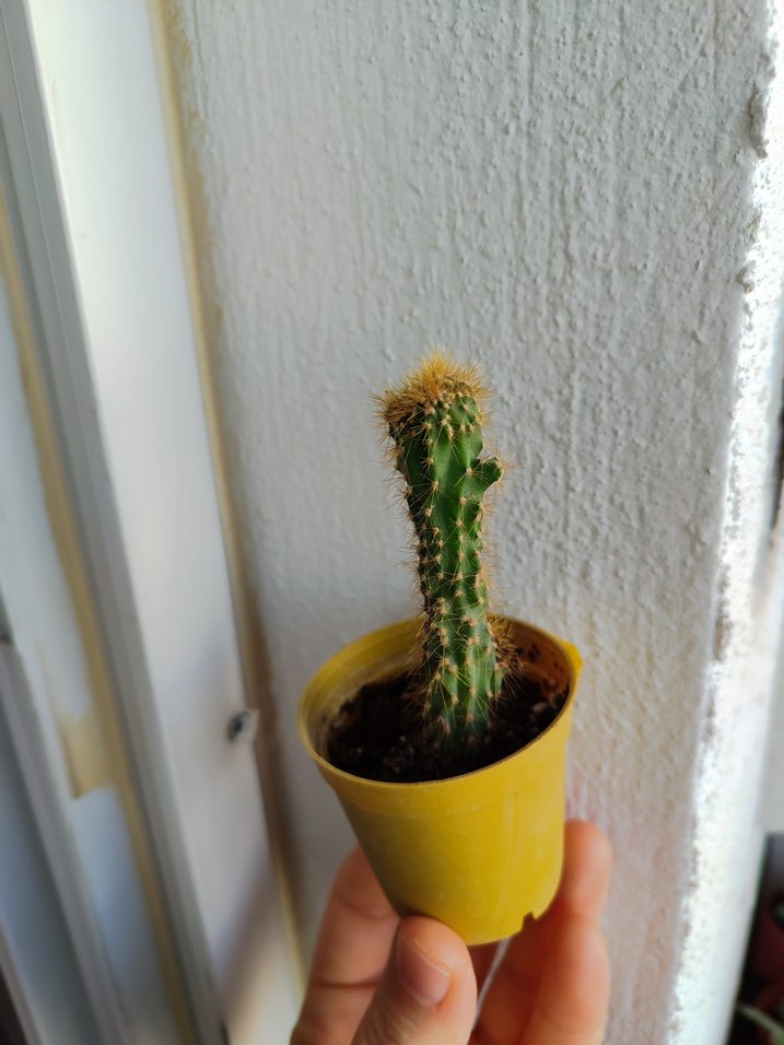 Bej renkli küçük saksıda minik kaktüs, ev dekorasyonu için sade bir seçim.