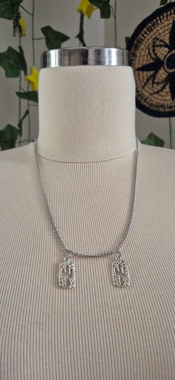 Gri renkte, zincir detaylı ve kaktüs desenli iki küçük kolye ucu ile günlük kullanıma uygun minimalist ve şık bir kadın kolyesi.