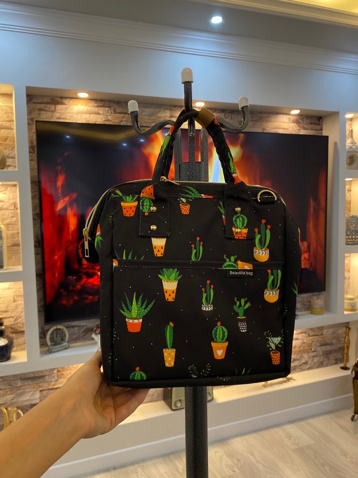 Kaktüs desenli siyah çanta. Kulplu, fermuarlı ve kompakt tasarıma sahip. Eşyalarını taşımak için uygundur.