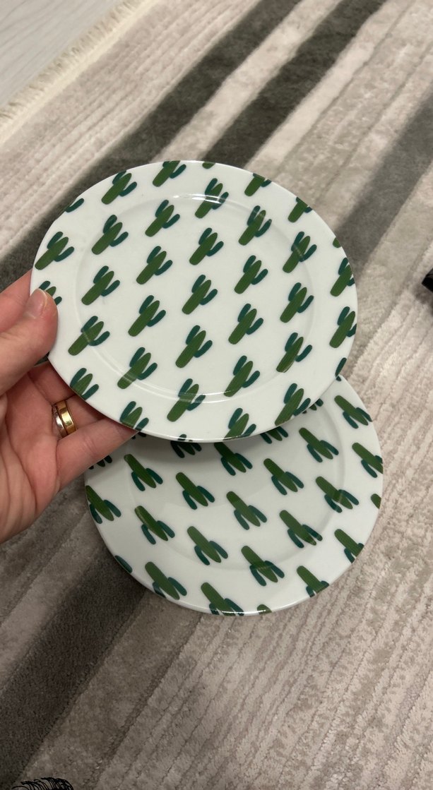 Kaktüs desenli, açık yeşil renkte, dayanıklı ve pürüzsüz malzemeden yapılmış tabaklar. Doğa temalı tasarım ile yemek sunumu için uygun. Hiç kullanmadım tatlı tabağı klasik tatlı tabaklarından biraz daha küçük mt olmadığı için ölçemedim ve 5 adet