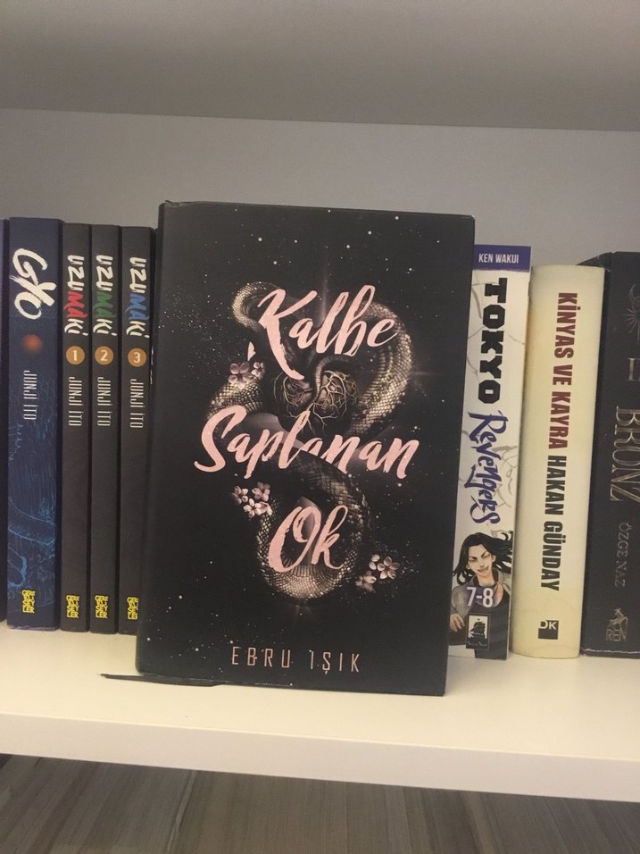 Ebru Işık'ın "Kalbe Saplanan Ok" adlı romanı, koyu arka plan ve zarif çiçek detaylarıyla dikkat çekiyor.