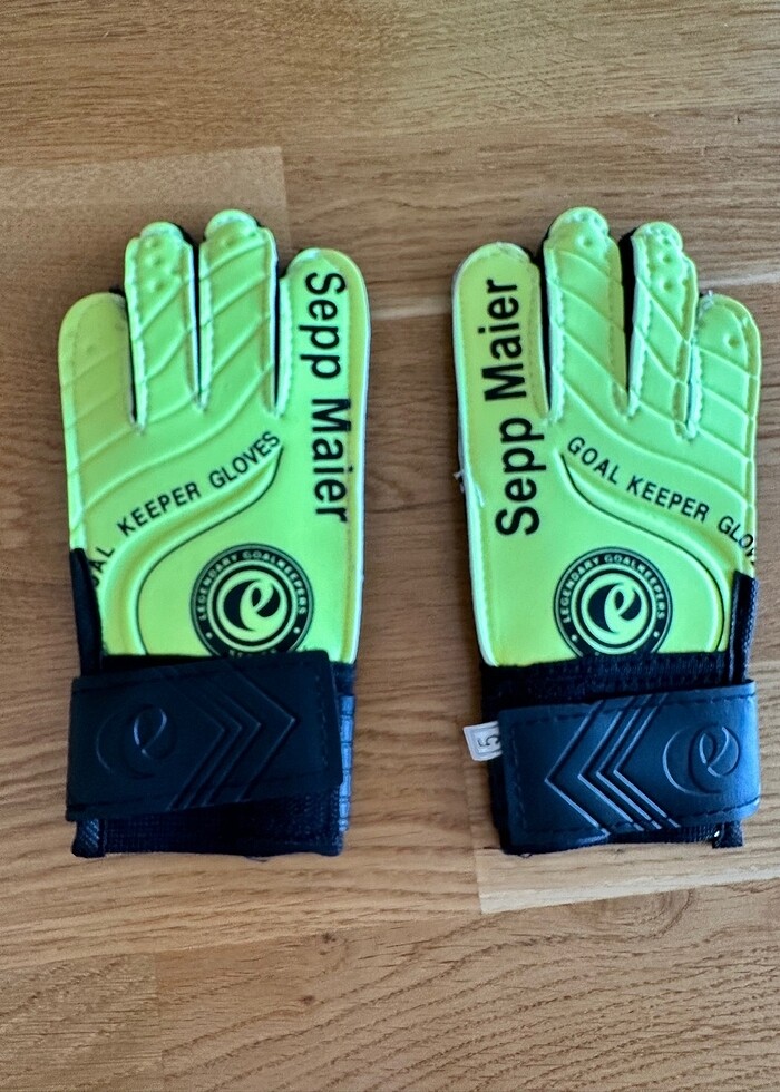 Yeni kaleci eldiveni. Sarı renk, 5 numara. Orta parmaktan bilek kısmına kadar 13 cm.