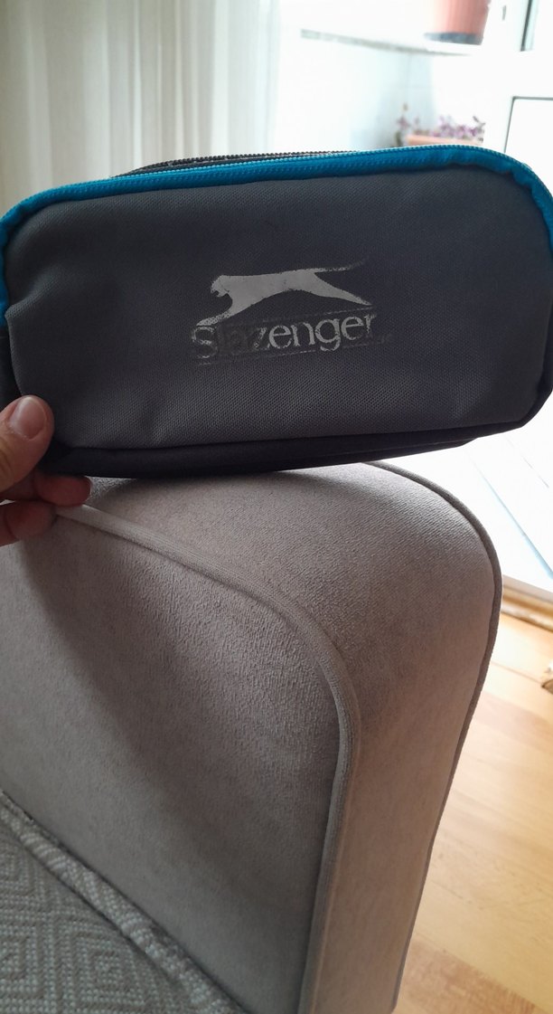 Fermuarlı, gri renkte ve baskılı kalem çantası iyi durumda.
