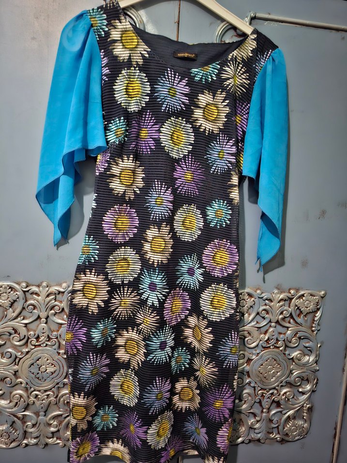 Renkli çiçek desenli, sentetik kumaştan yapılmış,hiç kırışmayan, likralı astarlı, tül kol,çok kullanışlı, tüm boy 92cm,koltuk altından koltuk altına 46cm,esneme payı var, bel çevresi 84cm,bir kez giydim ,ölçüyü esas alın