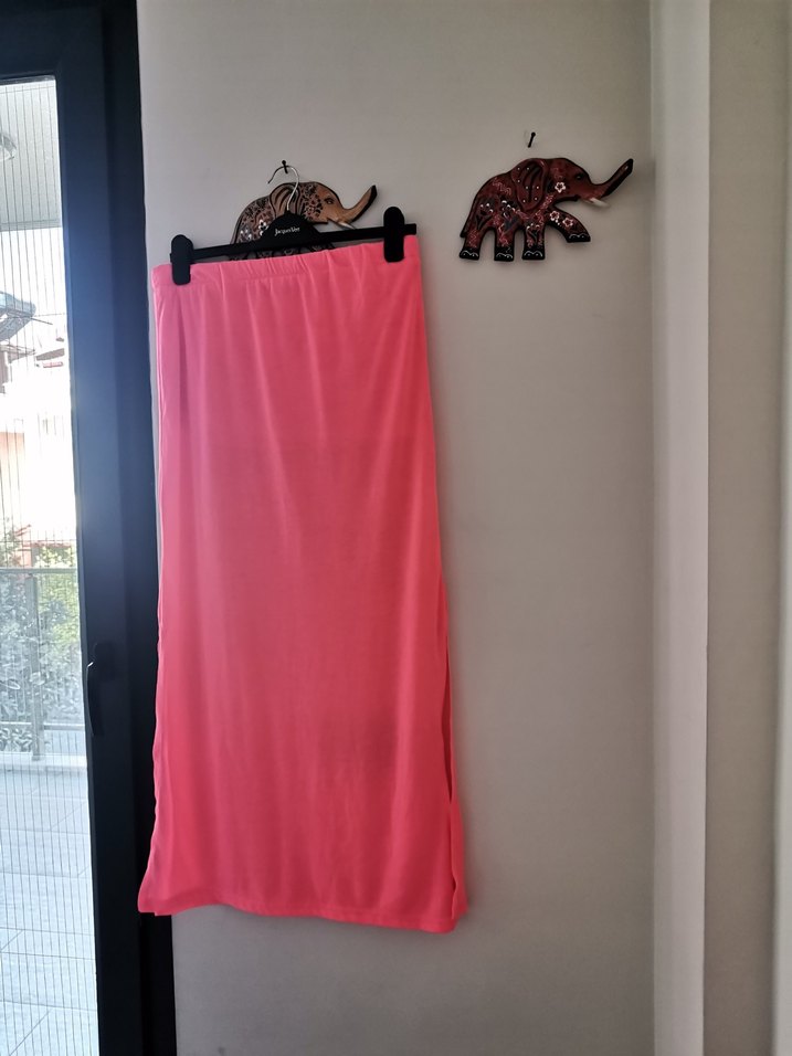 Beli lastikli kullanımı kolay yanlardan yırtmaçlı. İçinde 24cm astarı Beli 40cm. Boyu 94cm. Sorunsuz. Rengi koyu somon