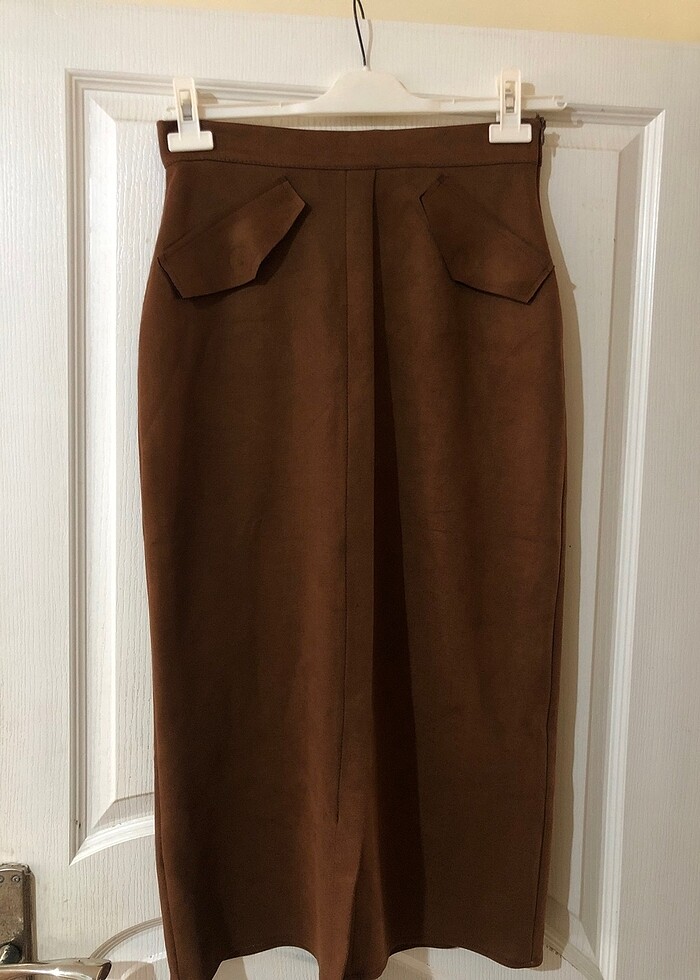 Cep detaylı Kadife taba renk etek yumuşak kumaşlı. Boyu 85cm