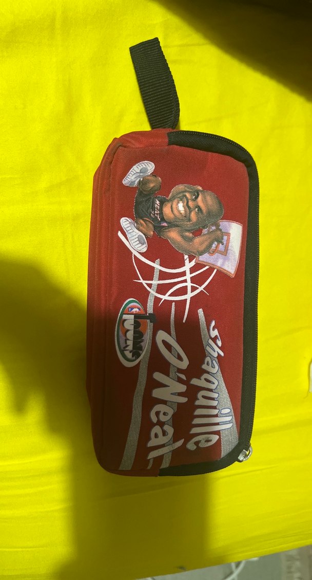 Kırmızı parlak çocuk okul çantası, önünde karikatür karakter ve 'Shaquille' yazısı bulunur. Fermuarlı ve sorunsuz .