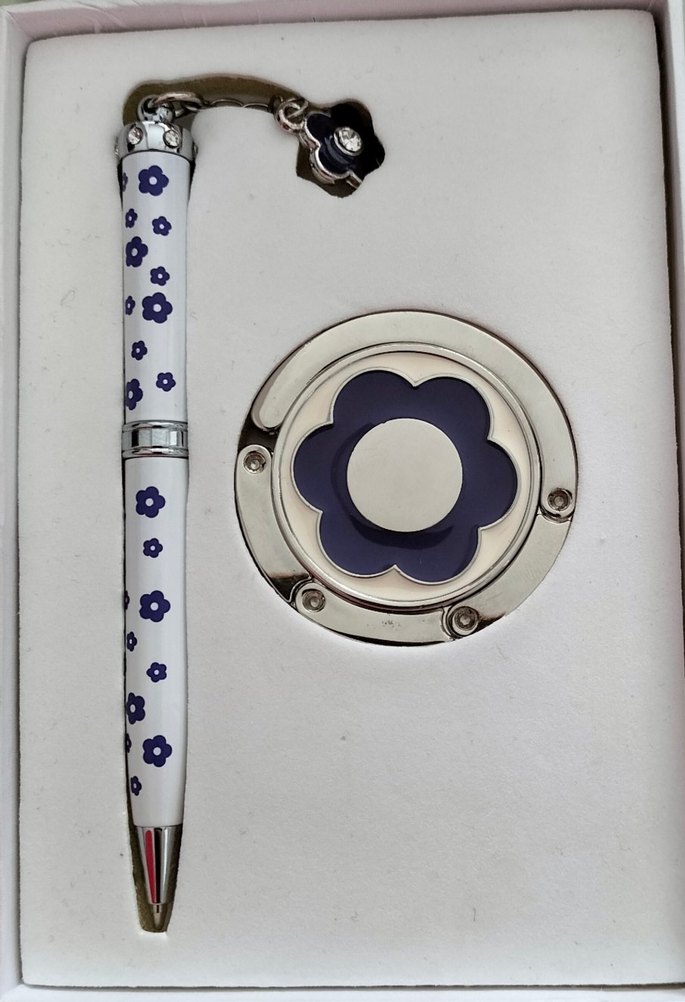 Mavi çiçek desenli renkli kalem ve çanta asma aparatı seti, masa kullanımı için uygun.