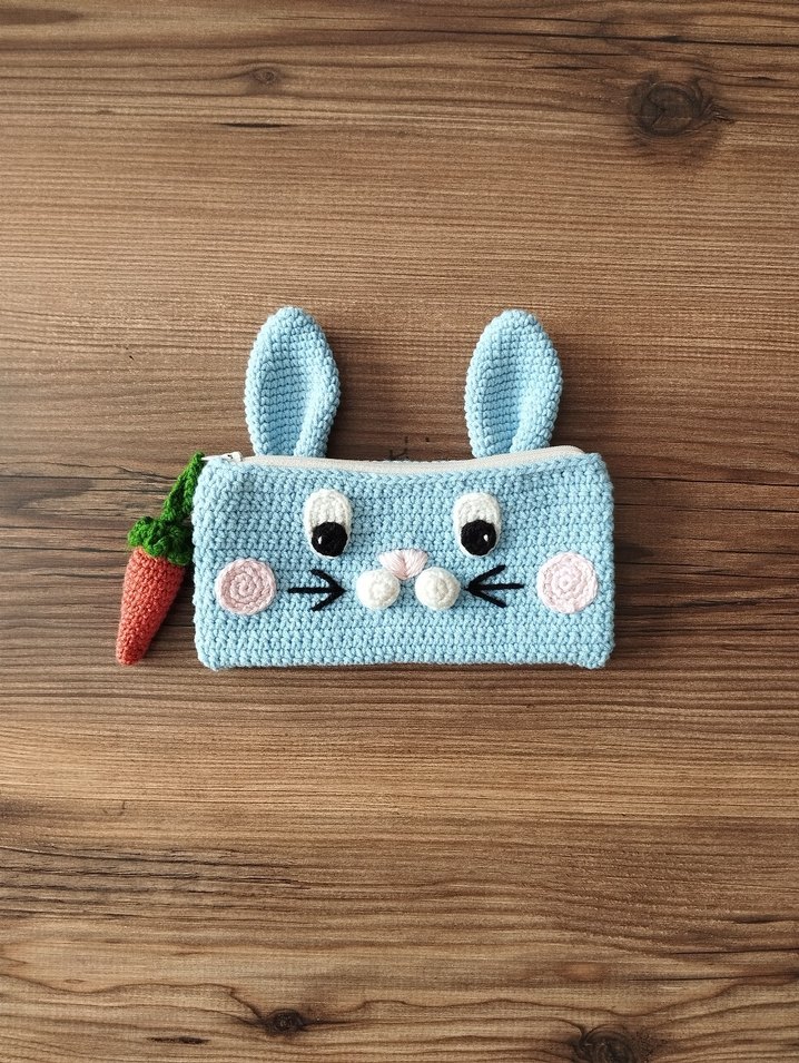 Nakışlı tavşan yüzü ve kulakları olan pastel mavi örgü kalemlik, küçük havuç aksesuarıyla tamamlanmıştır. Fermuarlıdır, pamuk ipten hazırlandığı için tüylenme yapmaz İstediğiniz renkte sipariş oluşturabilirsiniz