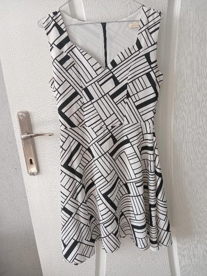 Kolsuz astarlı, pilili ve v yakalı midi elbise. Siyah beyaz çağdaş desenli, günlük kullanım için uygun, dar kesim.