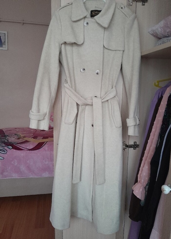 1-2 kere giyildi,yıkandı.Daha yeni tertemiz bir ürün.Kumaşı şahane.Yaşımı büyük gösterdiği için satma kararı aldım.40 beden ama ben 36 bedenim ve tam oturuyor üzerime.Krem bir rengi var çok hoş.Tam kışlık bir kaban.Çok kaliteli şahane gerçekten.Tekliflere açığım